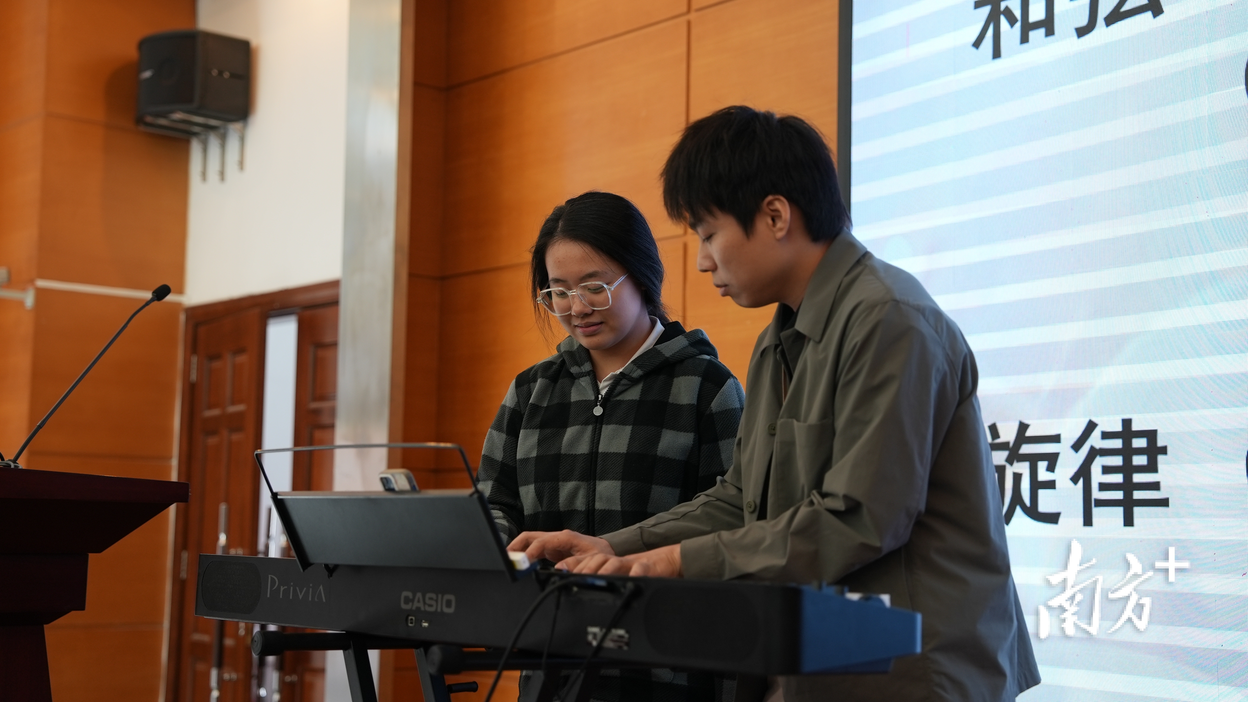 活动当天,学校报告厅内一场“音乐+科技”的跨界盛宴精彩上演。该环节中,资深音乐制作人谢云卿老师带来的《揭秘声音作坊,当音乐遇上科技》的主题分享,现场设置了趣味互动体验模块,学生们通过触摸式音序器创作简易旋律、利用AI音乐软件生成专属配乐、体验电子音乐制作的基础流程,直观感受科技为音乐行业带来的创新变革。